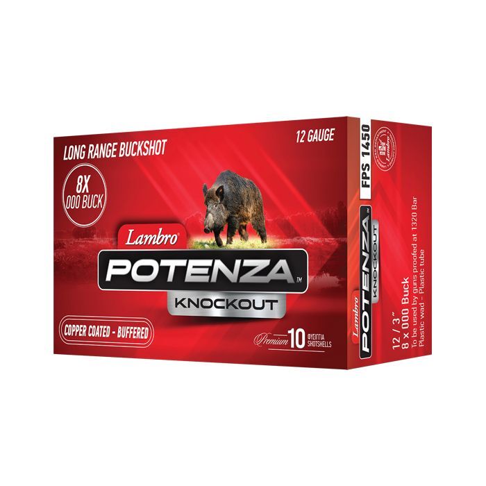 The new Potenza series of buckshots is characterized by unusually high velocities, impressive penetration combined with very tight concentration. The Knockout Magnm 8x with 9.1 mm buckshots and a speed of 470 m/s, has unlimited power to hold any wild boar at long distances. All buckshots of the new Potenza series carry C.I.P. safety certification.