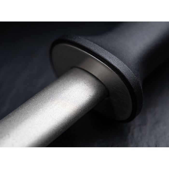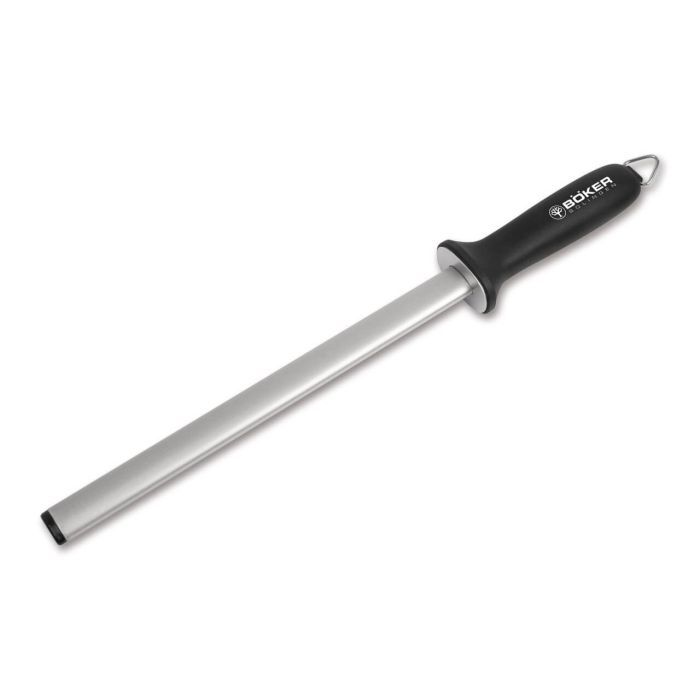 The diamond sharpening rod with a medium grain is suitable for sharpening any type of knife with a steel blade. Rods of this type are usually used for chef's knives. A break-resistant oval steel tube is used to support the industrial diamond coating. The effective usable length is 28 cm. Supplied with a durable black plastic handle and an eyelet for hanging.
