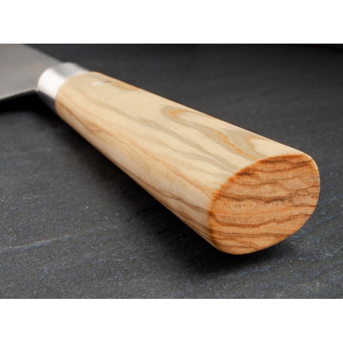 The Boker Damascus Olive Kitchen Knife line combines traditionally Japanese handles made of local Olive Wood with razor-sharp blades made of stainless Damascus with 37 layers of steel, characterized by a beautiful grain. The extremely high-impact core of the Damascus blade consists of the high-performance VG-10 steel. The noticeable sharpness when cutting is breathtaking and makes cooking an experience. The Japanese design of the knife handle with the matted stainless steel clamps gives the line its special character.