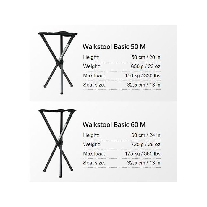 Walkstool Basic comes in two different sitting heights - 50 cm and 60 cm (20 in and 24 in). The seat is made of black polyester and is app. 20% bigger in size than a normal seat for a three legged stool. The legs are grey to match the seat.